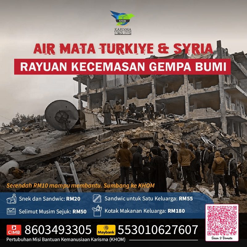 Serendah RM10, anda mampu membantu mangsa gempa bumi Turkiye dan Syria. Ayuh hadiahkan bantuan buat mereka dan semarakkan sedikit harapan ke dalam jiwa mereka yang memerlukan.