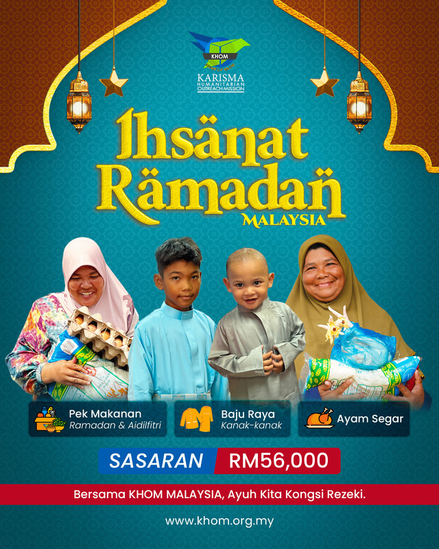 Misi Bantuan Kemanusiaan Karisma better known as KHOM, in full, the Karisma Humanitarian Outreach Mission is a fully registered, local non-profit organization bearing the registration number PPM-009-03-27112018. KHOM carries the motto ‘Light of Hope” aimed at alleviating the suffering of those caught in the world of conflict, disasters, hunger and poverty.