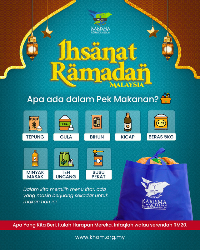 Ramadan ini, menerusi Bantuan Ihsanat Ramadan untuk Malaysia, KHOM MALAYSIA sedang mengumpul dana bagi membekalkan para keluarga yang kurang berkemampuan dengan barangan keperluan makanan agar mereka boleh bertahan sepanjang bulan ini – tanpa saban hari berasa bimbang apa yang hendak disediakan untuk sahur dan iftar.