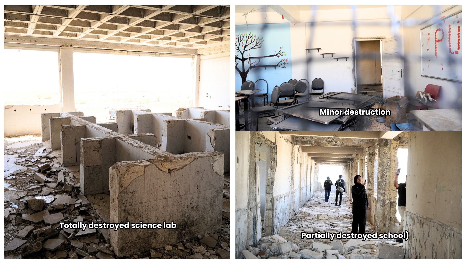 KHOM MALAYSIA berkunjung ke sekolah-sekolah yang terjejas akibat perang di Syria, diiringi En Fayez Al-Ghab, Pengurus Kawasan di bawah Gabenor Hama dan pegawai-pegawai tempatan. Apa yang kami saksikan membuat hati luluh: dinding dan siling dirosakkan dengan sengaja, pendawaian dicabut keluar, dan meja serta kerusi dimusnahkan oleh rejim lalu. Banyak bilik darjah tidak lagi dapat digunakan.