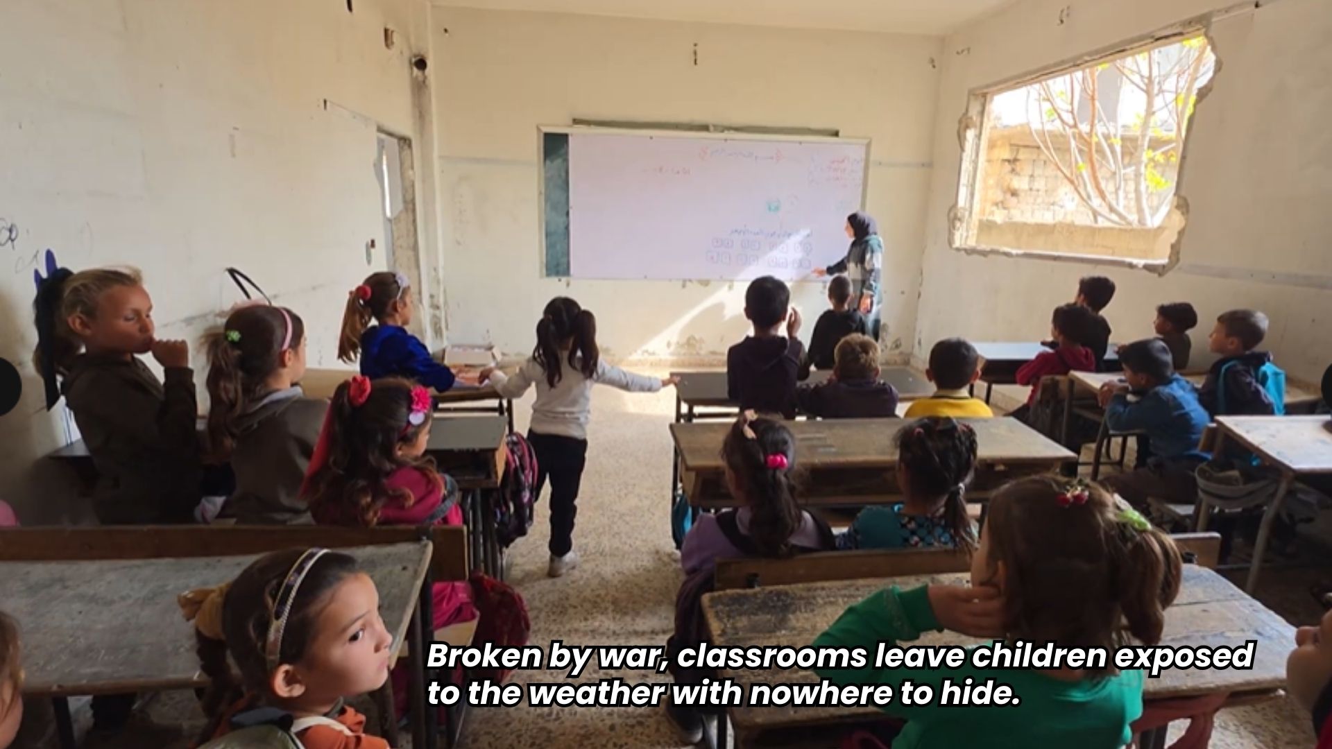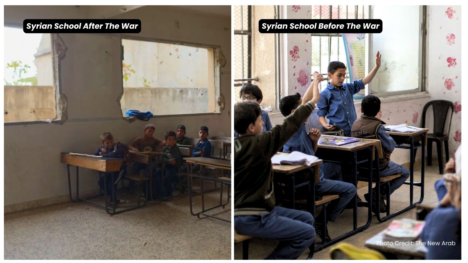 Perang saudara selama 14 tahun di Syria telah menghancurkan sistem pendidikan Syria. Banyak sekolah yang telah dirosakkan atau dimusnahkan menyebabkan bilik darjah sesak, dan para guru bergelut untuk mengajar dengan sumber yang terhad. Bilik darjah yang dulunya memuatkan 30 pelajar, kini bersesak sehingga 65 kanak-kanak di bawah kendalian seorang guru yang menjadikan pembelajaran hampir mustahil.