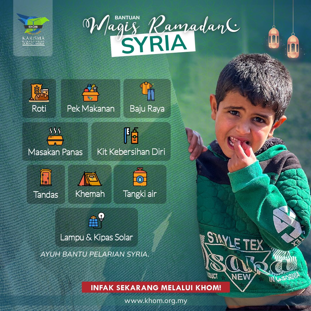 Hulurkan walaupun serendah RM10 untuk membantu warga Syria yang kurang bernasib baik pada bulan Ramadan yang mulia ini.
