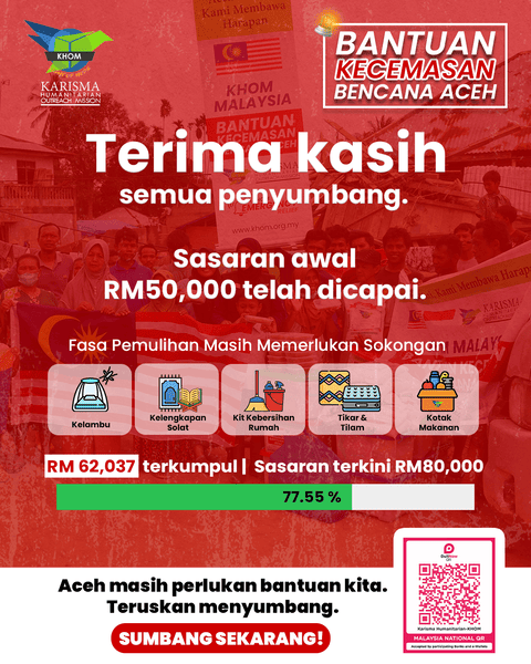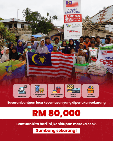 KHOM MALAYSIA is actively supporting the recovery of communities affected by the Aceh floods. Your contributions are urgently needed to fund the second phase of relief efforts and help these families rebuild their lives.
