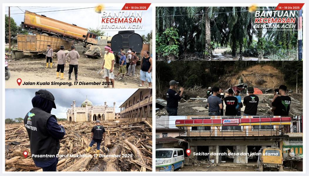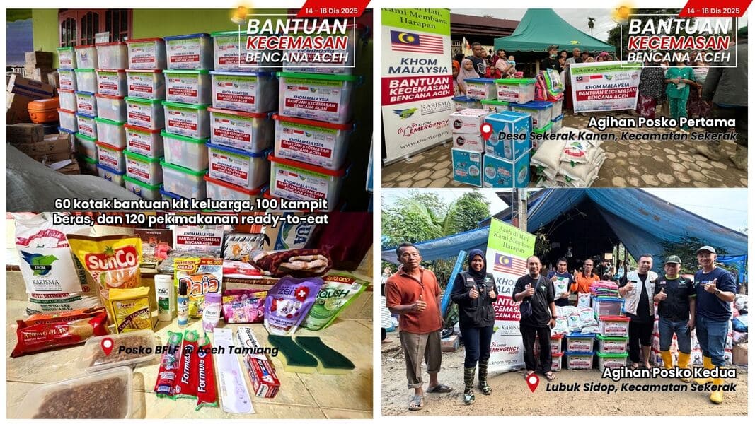 Sebagai respon kecemasan terhadap bencana banjir besar luar biasa seperti ‘mini tsunami’ yang melanda Aceh pada akhir November 2025, pasukan KHOM MALAYSIA telah digerakkan segera ke Aceh Tamiang, salah satu kawasan yang paling teruk terjejas. Walaupun berdepan situasi jalan raya dan jambatan rosak serta sistem komunikasi yang terputus, kami telah berjaya menembusi kawasan paling kritikal dan menyampaikan bantuan kepada lebih seribu mangsa banjir yang terpaksa berlindung di khemah.
