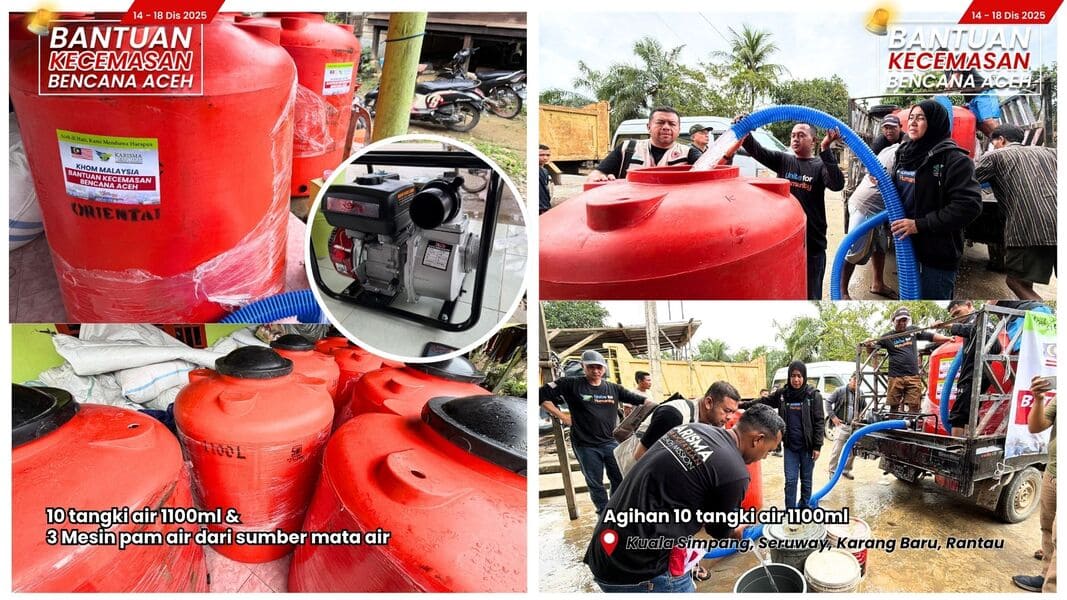 Bertindak terhadap keperluan mendesak bagi air bersih, kami segera mendapatkan 10 tangki air , mengisinya dengan air yang selamat untuk diminum, dan menghantarnya ke 10 kawasan terjejas untuk kegunaan segera orang awam.
