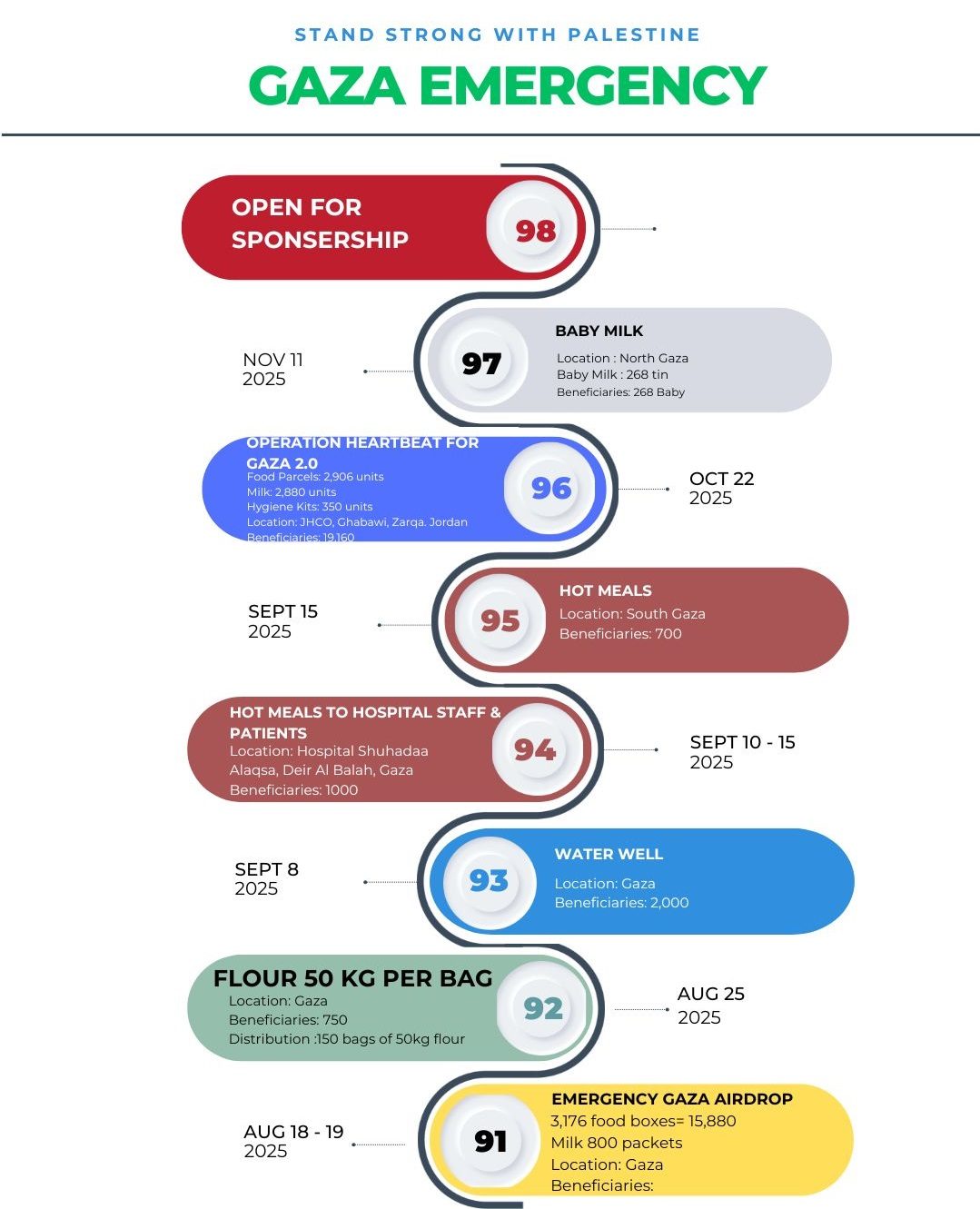 As of November 2025, KHOM MALAYSIA has successfully carried out over one hundred aid distributions across Gaza reaching out to over 150,000 beneficiaries — delivering food boxes, hot meals, baby milk, and essential winter items to thousands of affected families.