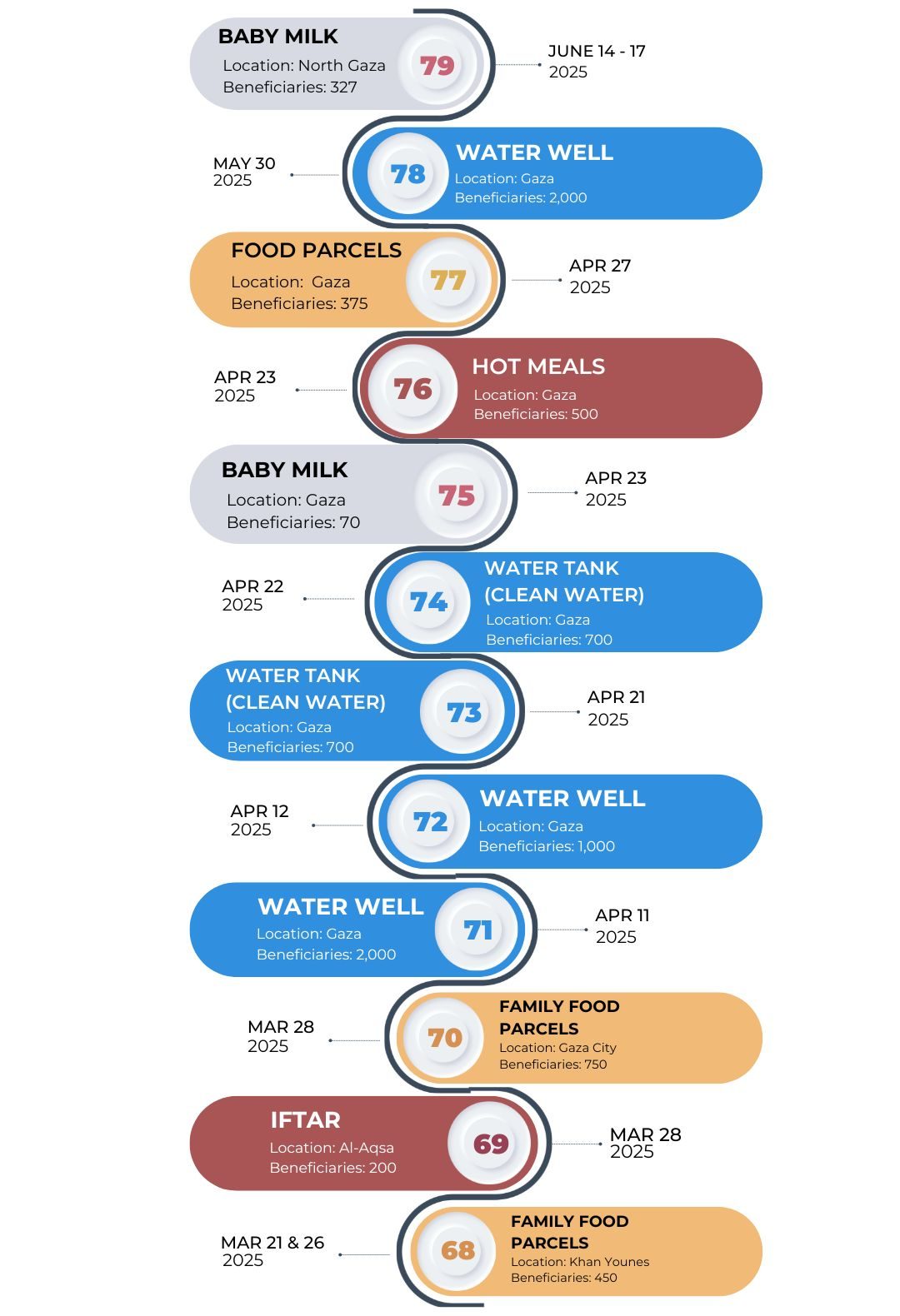 Setakat November 2025, KHOM MALAYSIA telah berhasil melaksanakan lebih seratus pengagihan bantuan di seluruh Gaza, menjangkaui lebih 150,000 penerima manfaat. – menyampaikan kotak makanan, hidangan panas, susu bayi, dan barangan keperluan musim sejuk kepada ribuan keluarga yang terjejas.
