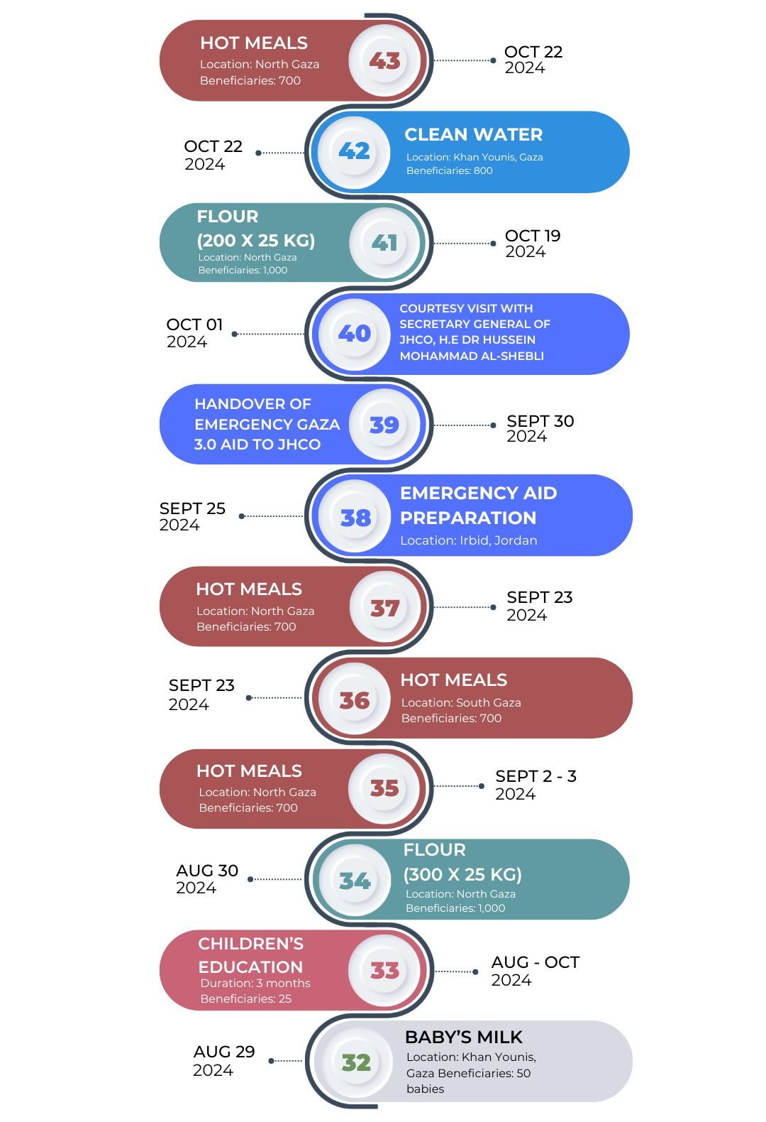 KHOM MALAYSIA telah berjaya menyerahkan lebih 2,906 kotak makanan, 2,880 bekalan susu bayi, dan 350 kit kebersihan diri kepada pihak berkuasa Jordan, sedia untuk penghantaran segera sebaik laluan masuk Gaza dari Jordan dibuka.