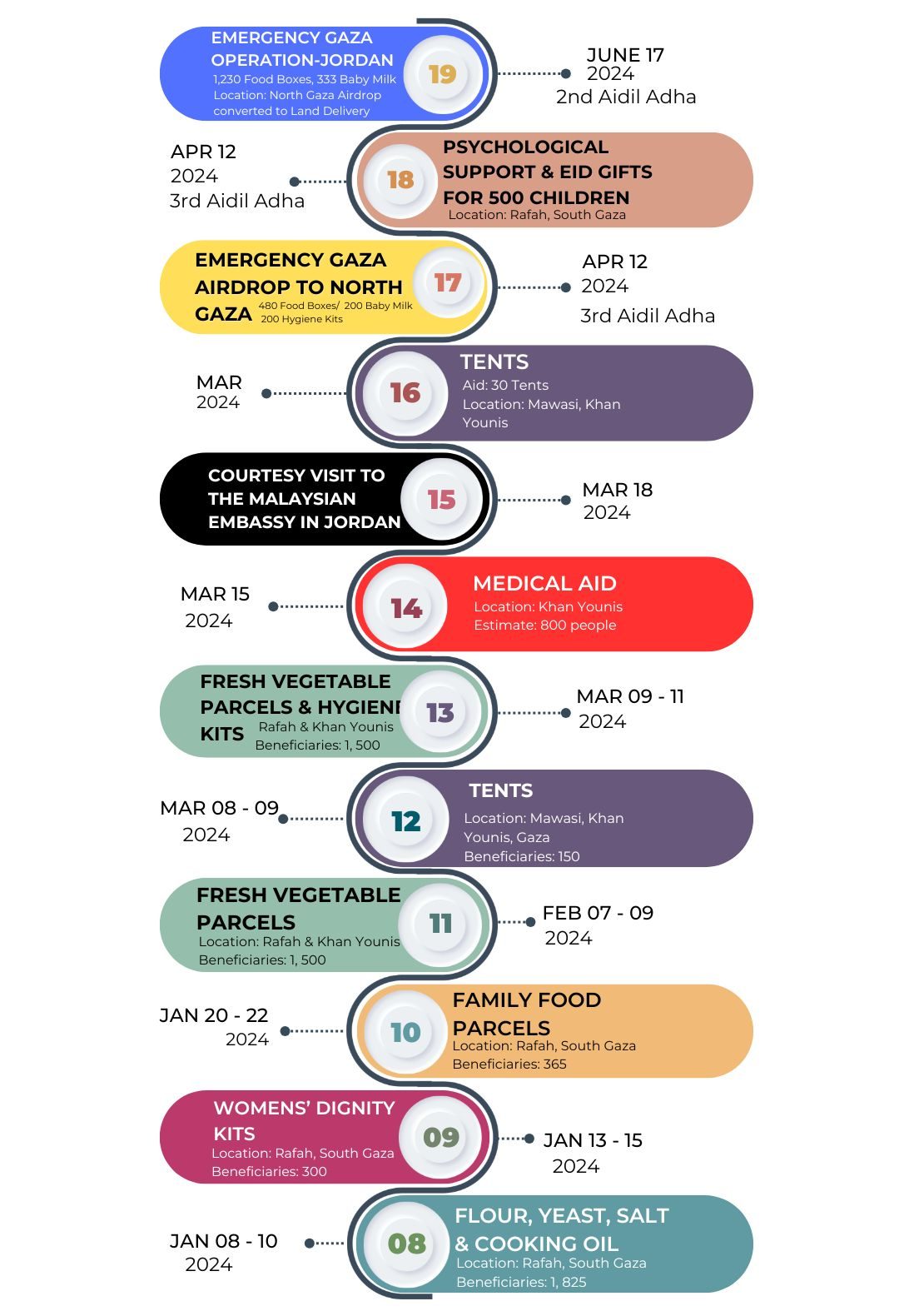 Pasukan Tentera Udara Diraja Jordan berjaya menyampaikan 480 kotak makanan kepada warga utara Gaza menerusi airdrop pada Aidilftiri ke-3 (12 April 2024), manakala Organisasi Kebajikan Hashimiyah Jordan (JHCO) memudahkan penghantaran 200 kit kebersihan diri dan kit maruah wanita, bersama 200 tin susu bayi menerusi laluan darat.