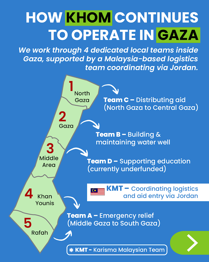 Working closely with trusted local and international partners, the KHOM MALAYSIA Team serves as the backbone of every KHOM mission — turning the generosity of Malaysians into life-saving action on the ground.