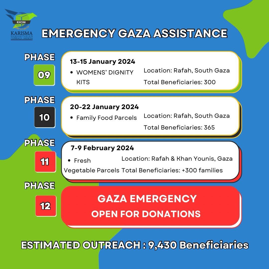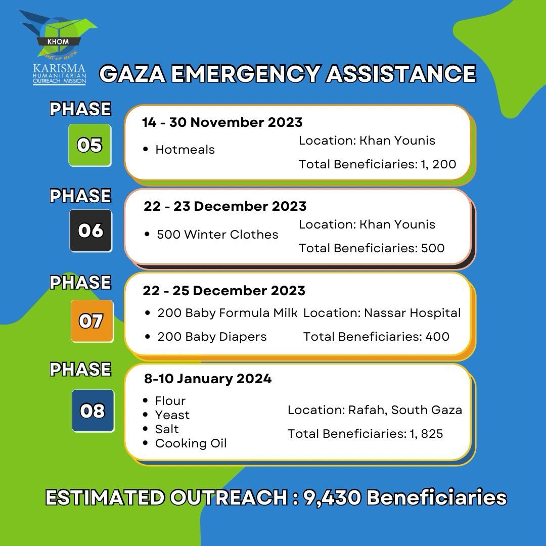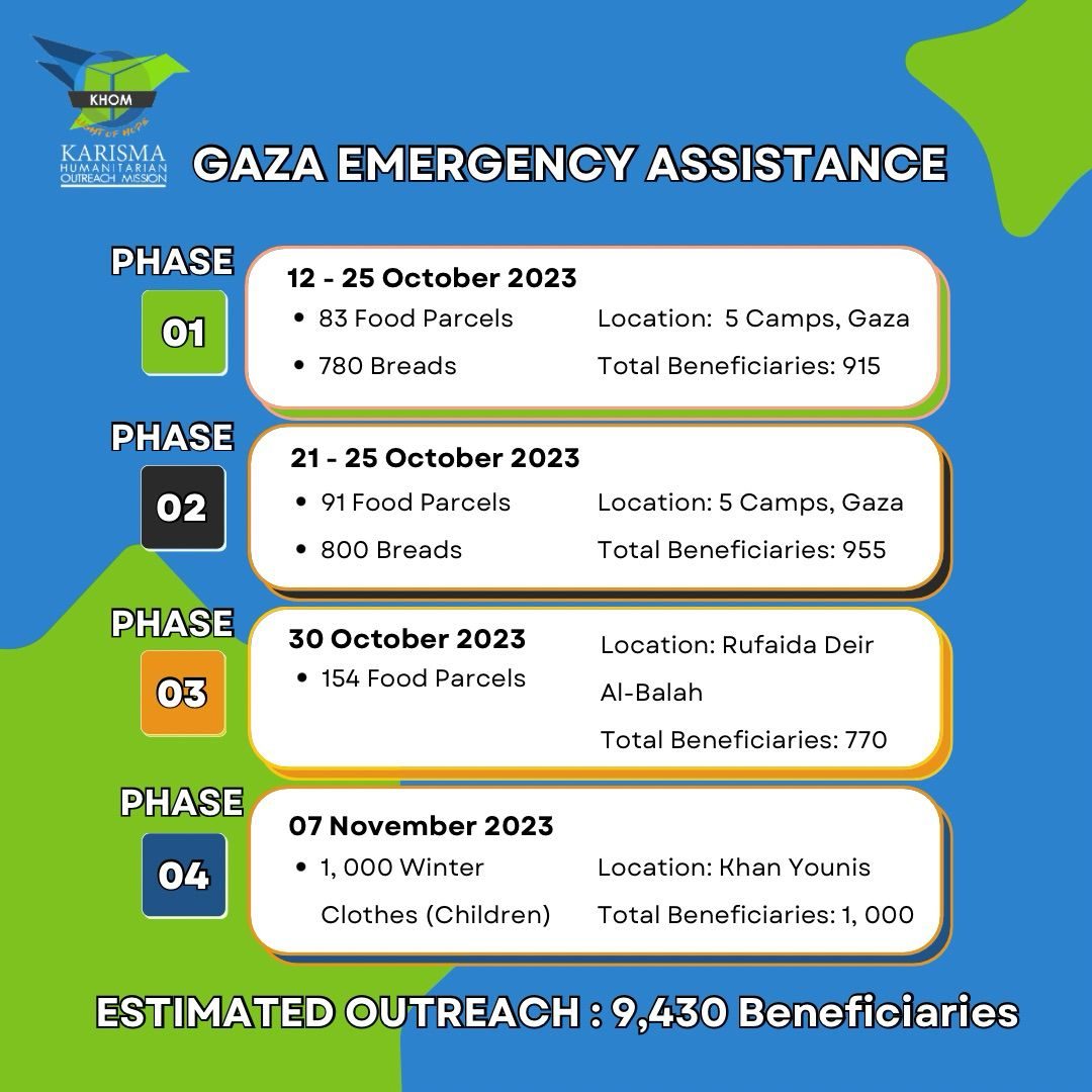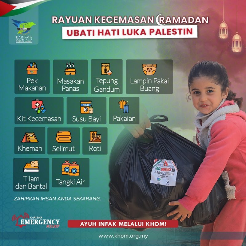 Berikutan situasi mendesak akibat perang yang membawa bencana di bahagian utara Gaza, kami, pasukan KHOM, dilanda rasa gundah, dan tidak dapat bertenang mengetahui saudara kita sedang menderita di sana, melihat anak-anak mereka mati kelaparan atau terbunuh di dalam serangan udara terutamanya dalam bulan Ramadan yang mulia ini.