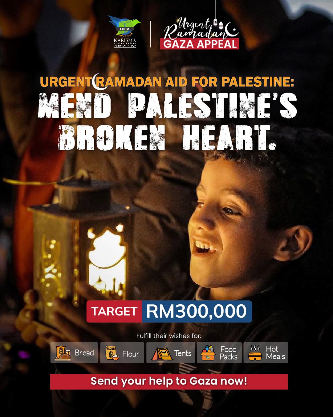 At least RM300,000.00 is needed to send Ramadan aid to at least 15,000 Palestinians.